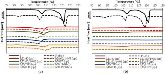 Elemental (crystalline) sulfur (S) exhibits two endothermal peaks during heating. The first of them occurs at temperature of approximately 107 °C and corresponds to the changes in the crystalline structure of sulfur from orthorhombic (Sα) to monoclinic (Sβ). The second one, which occurs at temperature of approximately 120 °C, is related to the melting of Sβ crystals and residual Sα crystals into yellow liquid (Sλ). A similar situation is observed in the case of sulfur polymer (SP) before (bp) as well as after the purification process (ap), because the content of macromolecules (polymeric phase) in sulfur polymer is very low, due to their instability under ambient conditions, and it contains crystalline sulfur even after the purification procedure. In this case, the peaks originated from the crystalline phase (unreacted sulfur) are also clearly visible.