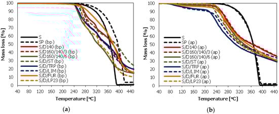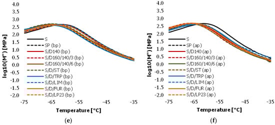 It is evident that in some cases the curing with sulfur/organic copolymers results in vulcanizates even with higher crosslink density than the reference sample cured with elemental (orthorhombic) sulfur, for example, in the case of samples cured with copolymers after the purification process, based on DCPD and turpentine (S/D/TRP (ap)), DCPD and styrene (S/D/ST (ap)), or DCPD and furfural (S/D/FUR (ap)) or DCPD and Thiokol LP23 (S/D/LP23 (ap)). Possibly, this is due to the fact that the curing process with purified sulfur/organic copolymers may occur without intramolecular modifications of the rubber chains, i.e., cyclic sulfidic structures, which is a common phenomenon for curatives based on elemental sulfur [