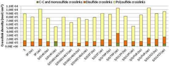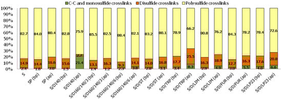 Figure 4 and 5 show that all cured samples contain predominantly polysulfidic crosslinks (no fewer than 66.2% in the case of sample S/D/TRP (ap)), moderate content of disulfidic crosslinks and moderately low content of monosulfidic and C–C crosslinks. In general, in most of the cured samples, the ratio between various crosslinks being formed is preserved constant and corresponds to the reference sample (S) cured with elemental sulfur. The exception is sample S/D140 (ap) which contains significantly higher monosulfidic and C–C crosslinks (21.4%) than other samples (on average 4.4%), which may influence mechanical properties of the vulcanizate.