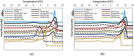 Figure 6 show that for pure (free) cyclohexane only one intensive peak of freezing occurs at temperature of approximately 10 °C. Whereas, for all rubber samples swollen in cyclohexane to equilibrium before the analysis and immersed in free cyclohexane in DSC crucible during the analysis, it is visible that two peaks appear. First of them (at higher temperature) corresponds to the freezing of free cyclohexane and the second one (at lower temperature) corresponds to the freezing of cyclohexane that is entrapped in the polymer (rubber) network. In every case both peaks are well separated (not overlapping) and quite developed.