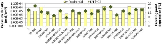Comparing the crosslink density results with freezing point depression results, it is easy to notice that differences between results obtained from both methods exist. However, in most cases the legitimate trend is retained, which refers to the comparison of the crosslink density calculated from the Flory–Rehner equation and crosslink density changes estimated from the freezing point depression results (∆
