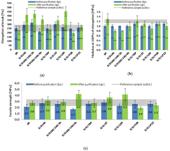 Figure 8a) suggest that the vulcanizates cured with sulfur/organic copolymers before and after the purification procedure exhibit classical dependence between crosslink density and their elasticity. The samples of lower crosslink density, i.e., S/D140 (ap), S/D160/140/3h (ap) and S/D/LIM (ap) exhibit higher elongation at break (above 400%) and the other way around, the samples of higher crosslink density, i.e., S/D/TRP (ap) and S/D/FUR (ap) exhibit significantly lower elongation at break (below 250%), being also more stiff. Furthermore, in general the vulcanizates cured with purified sulfur/organic copolymers exhibit visibly higher