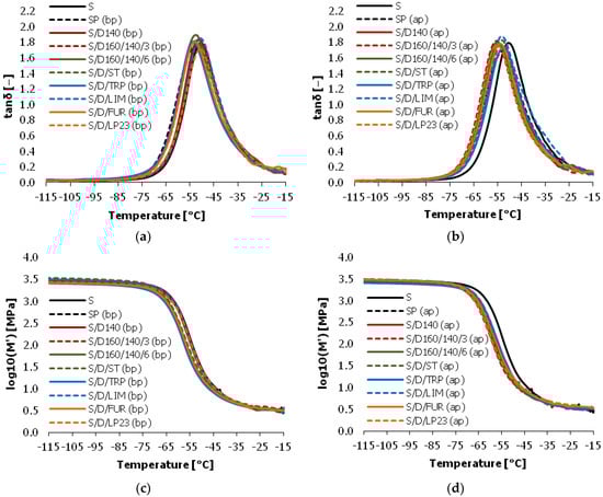 Considering the results of glass transition temperature (Tg) we observe that in general the vulcanizates cured with purified sulfur/organic copolymers exhibit lower Tg than before purification and the reference sample. The Tg values are lower even up to 5 °C in the case of sample pairs S/D160/140/6h and S/D/LP23. It is most probably the result of different morphology of crosslinks formed during vulcanization with purified copolymers. Sulfur/organic macromolecules form longer and more flexible crosslinks than low molecular sulfur, so they are more mobile and can undergo greater deformation, rearrangement and orientation under external forces. It makes Tg of the vulcanizates lower. The exception is the sample cured with sulfur/DCPD/turpentine copolymer (S/D/TRP), which Tg increases when cured with the purified copolymer. This is most probably a result of removing of organic components of turpentine which did not react with sulfur and acted as a plasticizer. Turpentine consists mainly of pinene, which is an unsaturated compound. However, as a bio-solvent obtained from tree resin distillation, it contains also a significant amount of various saturated hydrocarbons which were removed during the copolymer purification in toluene. In general, the values of loss factor (tanδ) of vulcanizates at their glass transition are very similar; however, one can notice that the vulcanizates cured with purified copolymers exhibit slightly lower values of tanδ maxima. This indicates that they may have a little lower ability to suppress vibration.