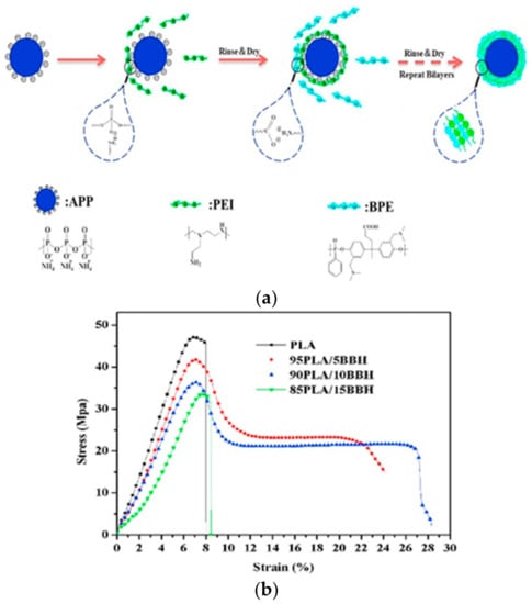 (a) Process for layer-by-layer assembly of FR; and (b) strain-stress curves of neat PLA and PLA/FR composites (Adapted with permission from [44]).
