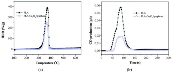 (a) Heat release rate and (b) CO curve of the PLA/CO3O4/graphene composite (Adapted with permission from [69]).