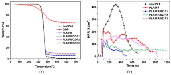 Αlpha-zirconium phosphate (α-ZrP) is an important layered nanostructure material because of its versatile nature and unique anion exchange properties. It has been widely applied as a FR for several polymers, but its application for PLA is not extensive. The combined effect of α-ZrP and intumescent flame retardant (IFR) on flame-retardant PLA was investigated [81]. The result suggests that α-ZrP increases the thermal stability and char yield of PLA (Figure 5a).
