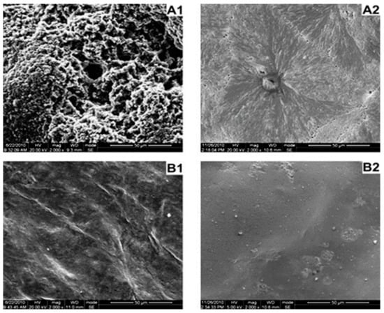 SEM images of char residue after cone calorimeter test: (A1,A2) the outer surface and the inner surface of PLA/IFR; and (B1,B2) the outer and inner surface of PLA/IFR/α-ZrP2 (Adapted with permission from [81].