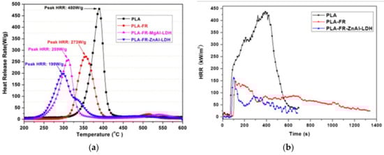 Layered double hydroxides (LDHs) are an emerging class of flame retardants additives with great prospects in fire chemistry and smoke suppression due to their unique chemical conformations and layered structure [82,83]. The flame retardant and smoke suppression mechanism of LDHs involves the loss of interlayer water, intercalated anions, and dihydroxylation to form metal oxides, which absorb large amounts of heat and dilutes the concentration of O2 [84]. This phenomenon promotes the creation of carbonaceous char on the polymer thereby protecting the bulk polymer from air and suppressing smoke production due to suffocation. PLA nanocomposites based on organo-modified zinc aluminum layered double hydroxide (Zn-Al-LDH), ammonium polyphosphate (APP), pentaerythritol (PER), and melamine cyanurate (MC) in the mass ratio 1:2:2 at total loading of 25% was prepared [85], and the results showed that the presence of 2% Zn-Al-LDH in the PLA/FR matrix decreased the PHRR by 58% in both the microscale combustion calorimeter (MCC) and cone calorimeter (Figure 7a,b).