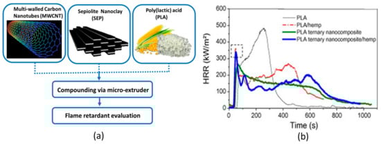 (a) Fabrication process of MWCNT/SEP/PLA composite (modified); and (b) PHRR of MWCNT/SEP/PLA composite (Adapted with permission from [96]).