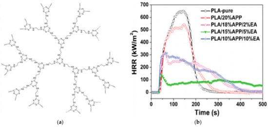 The incorporation of hyperbranched polymers into PLA together with other traditionally-known flame retardants has been reported [114,115]. PLA composites containing a certain percentage of ATH and hyperbranched polymer (HBP6) via direct melt compounding was prepared where a high LOI value of 41% and UL-94 V-0 rating was attained with the mass ratio of 29:1 by ATH to HBP6 [116]. It was proposed that the presence of hyperbranched polymers in PLA/FR composites can improve its mechanical properties. Pursuant to this, the combinatory effect of a derivative hyperbranched polymer containing a triazine group (Figure 9a) and APP with PLA was studied in a mass ratio of 15:5 [117]. Unfortunately, its mechanical properties were not investigated, but the composite had excellent anti-dripping properties, high LOI value (41.2%), and lower PHRR (Figure 9b) compared to other hyperbranched flame retarded PLA composites.