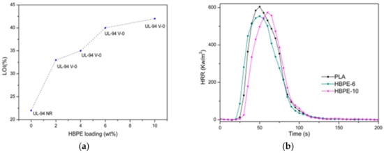 Similarly, the effect of hyperbranched polyamine charring agent (HPCA) and APP on flame retardant and anti-dripping properties of PLA was studied [118]. It was observed that 30 wt % HPCA and APP loading at a mass ratio of 1:1 was ideal for obtaining excellent flame retardant and anti-dripping effects for PLA composites. Additionally, a hyperbranched poly(phosphamide ester) oligomer (HBPE) was synthesized via A3 + BB′ mechanism (3 parts of poly(phosphamide ester) oligomer and two parts of a derivative of triazine) and melt blended with PLA [119]. The FR properties of the HBPE/PLA composites were investigated using standard test procedures. Interestingly, only 2 wt % HBPE with PLA exhibited excellent flame retardancy (LOI value of 33% and UL-94 V-0 rating) (Figure 10a and as the content of HBPE increased to 10 wt %, the LOI value of the PLA composites also increased to 43% with a prolonged time to ignition (TTI) but with insignificant decrease (19.8%) in PHRR (Figure 10b). The minimal decrease in PHRR was accompanied by melt dripping and increased CO and CO2 emissions. The study, however, failed to evaluate the effect of HBPE flame retardant on the mechanical properties of PLA polymer.