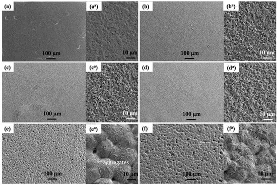 FESEM (magnification: 100×) images of surface morphology of (a) bare linear low-density polyethylene (LLDPE), (b) LLDPE/100T, (c) LLDPE/75T25Z, (d) LLDPE/50T50Z, (e) LLDPE/25T75Z, and (f) LLDPE/100Z. Illustrations on the right refer to high magnification (1000×) FESEM images (aa–fa) of the corresponding LLDPE nanocomposites.