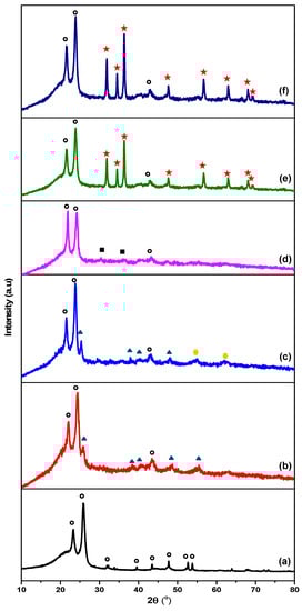 XRD patterns of (a) bare LLDPE, (b) LLDPE/100T, (c) LLDPE/75T25Z, (d) LLDPE/50T50Z, (e) LLDPE/25T75Z, and (f) 100Z. [○: LLDPE, ▲: Anatase, ⬣: ZnTiO3, ■: Zn2Ti3O8, ★: Zincite (ZnO)].