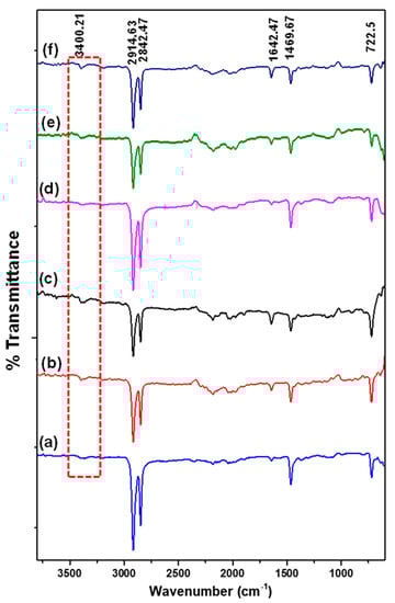 FT-IR is one of the most widely used tools for polymer characterization due to its sensitivity towards molecular environment, as well as chain conformation and morphology, particularly concerning the detection of energy levels transition in macromolecules [44,45]. Figure 3 shows the FT-IR spectrum of bare and LLDPE/metal oxide nanocomposites. Bare LLDPE (Figure 3a) revealed characteristic peaks at 2914.63 and 2842.47 cm−1, indicating C-H stretching vibrations of CH2 and CH groups, respectively [46]. Another band recorded at 1642.67 cm−1 could be associated to CH3 bonding deformation. The peaks at 1469.67 and 722.5 cm−1 are attributable to CH2 bending deformation and rocking deformation, respectively. The FT-IR spectrum of LLDPE nanocomposites seemed to be similar to that of bare LLDPE, except for a shallow broad peak of O–H at 3400.21 cm−1 (red-dashed frame), which refers to a characteristic band for hydroxyl group at the surface of the metal oxides [47]. The presence of LLDPE characteristics in the nanocomposites were noted with slight reduction in terms of intensity, hence signifying that the chemical structures have been preserved without the formation of appreciable chemical bonds between LLDPE and nanoparticles. The peak intensity for LLDPE/50T50Z at 2914.63 and 2842.47 cm−1 was more intense, when compared to other LLDPE nanocomposites, which can be attributed to the intense stretching vibration of LLDPE matrix.