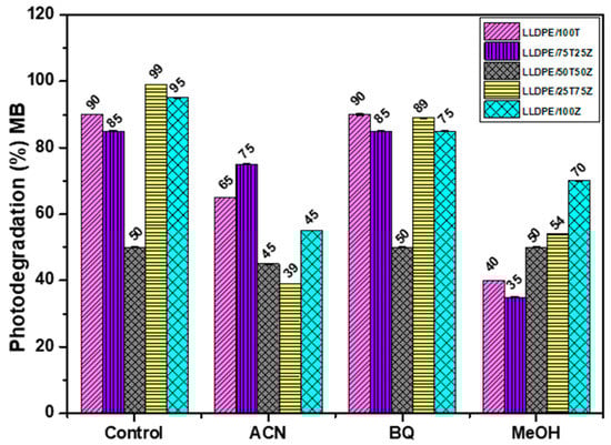Influence of radical scavengers on photodegradation of MB over LLDPE/100T, LLDPE/75T25Z, LLDPE/50T50Z, LLDPE/25T75Z, and LLDPE/100Z, under sunlight: Control (LLDPE nanocomposite with MB alone), BQ as scavenger for O2•¯radical, MeOH as scavenger for h+ and ACN scavenger for •OH radical.