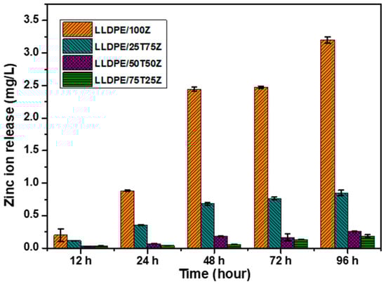 The release of metal ion from LLDPE nanocomposites also has an integral role in determining the antibacterial properties of LLDPE nanocomposites. In this study, the release of zinc ions (Zn2+) was evaluated by immersing LLDPE nanocomposites in water for 12 h until 96 h. After the immersion period, the water was analyzed to determine the dissolved Zn2+ ions, as shown in Figure 5. For the entire LLDPE nanocomposites, the release of Zn2+ increased with time, which is attributed to the disintegration of the existing intermolecular hydrogen bonding between LLDPE and water molecules. Water diffusion has an impact on the plasticity of LLDPE matrix and permits more favorable conditions for the release of Zn2+ ions. The outputs demonstrate that the rate of Zn2+ ion release differed for each LLDPE nanocomposite. The release of Zn2+ ions was significantly higher for LLDPE/100Z, and followed by LLDPE/25T75Z. The other LLDPE nanocomposites, however, did not exhibit appreciable release within the fixed time. The high rate of Zn2+ ion release showcased in LLDPE/100Z is ascribed to enhanced water diffusion characteristics and the amorphous nature of LLDPE nanocomposite. The voids in LLDPE/100Z (Figure 1f) may have accelerated the entry of water molecules and the migration of zinc ions. In light of this, LLDPE/25T75Z with steady increment could stand a better chance for long-term application, in comparison to LLDPE/100Z. This is yet to be proven and the related research is ongoing. Overall, the outcomes support low-degree polymer matrix, presence of ZnO phase, nanoparticles with hydrophilic nature, and void-controlled ion release.