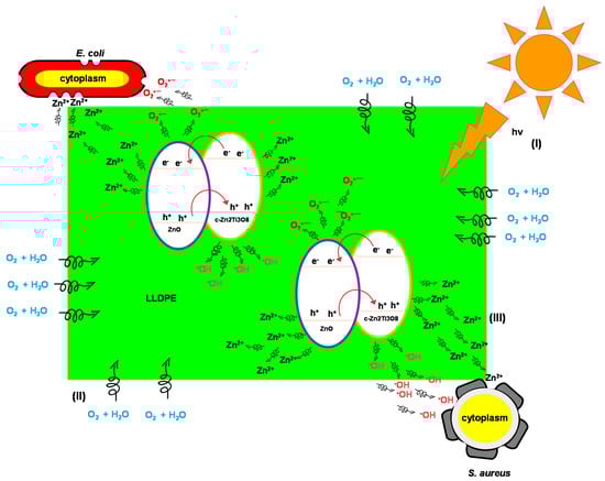 LLDPE/50T50Z appeared to be less effective below 24 h, and the reason is probably due to the dominant c-Zn2Ti3O8 phase with low-degree crystallinity, which resulted in low photocatalytic reaction. Besides, the C-index of this sample was relatively higher, suggesting slow water uptake through the polymer matrix for ion or reactive species release. Figure 6 presents the findings for antibacterial mechanism of LLDPE nanocomposites against S. aureus and E. coli. Under sunlight illumination, a pair of negatively-charged electrons and a positively-charged electron hole had been created, as illustrated in reaction pathway (I). Upon contact with O2 and H2O when they reached the surface, the O2•− and •OH radicals were generated, respectively (Equations (4) and (5)). These radicals are extremely reactive when in contact with bacteria. The initial oxidative damage occurs on the cell wall where LLDPE/25T75Z photocatalytic surface makes the first contact with the intact cell. With increment in contact time, the diffusion of H2O is also increased (pathway (II)), thus allowing O2•¯ to react with H+ so as to generate HO2• radicals and subsequently produce HO2− (Equation (6)). These, in solution, can react with H+ to form H2O2 (Equation (7)). The generated H2O2 is diffused into the inner membrane and causes cell membrane damage. Damage inflicted upon the cell membrane directly leads to leakage of minerals, proteins, and genetic materials, thus causing cell death. Concurrently, the leaching of Zn2+ from LLDPE/25T75Z into the growth media that occurs in pathway (III) promotes cell death. Therefore, the toxicological mechanism of Zn2+ plays an important role in rupturing the cell wall by degrading lipoprotein C- and N-terminals, which is the cause for the destruction of the outer membrane structure.