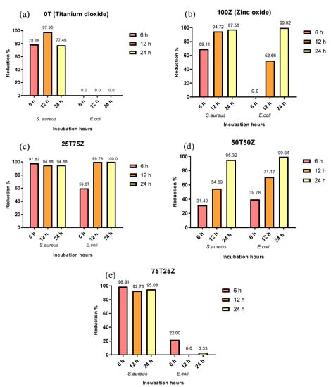 Antibacterial efficiency of LLDPE nanocomposites with different metal oxide ratios (a) LLDPE/100T, (b) LLDPE/100Z, (c) LLDPE/25T75Z, (d) LLDPE/50T50Z, and (e) LLDPE/75T25Z against S. aureus and E. coli.