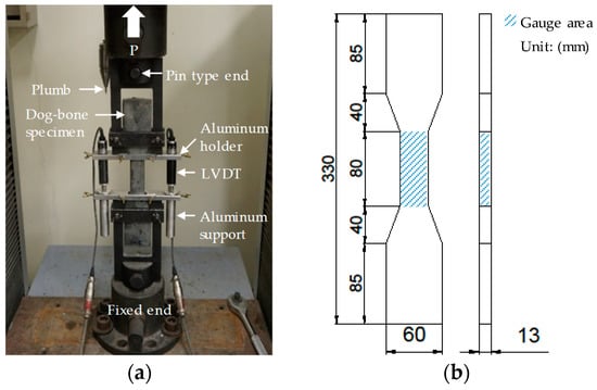 Uniaxial tensile tests were performed in accordance with JSCE recommendations [20]. The test setup and geometry of a tensile specimen are illustrated in Figure 1. A UTM with a loading capacity of 300 kN which was produced by Shimadzu Corp. (AG-300KMX, Kyoto, Japan) was utilized for the tensile test. A load cell and two linear variable displacement transducers (LVDTs) were installed, as shown in Figure 1a, to measure the tensile load and displacement, respectively. The measured load and displacement were transferred to the tensile stress and strain of the gauge area with a cross sectional area of 30 × 13 mm2 and a height of 80 mm shown in the Figure 1b. The uniaxial load was applied based on a displacement control with a loading rate of 0.4 mm/min. Five specimens were tested for each variable and the results were averaged to obtain reliable and representative values.