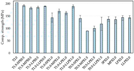 The compressive strength data of all tested specimens are summarized in Figure 2. The effect of fiber types on the compressive strength are generally less than the tensile properties of UHPCCs [6,21]. Based on the test results of this study, however, it was found that the PE fibers noticeably deteriorate the mixture fluidity and compressive strength. The highest compressive strength of the T2.0 specimen was found to be 204.4 MPa, and the compressive strength decreased with an inclusion of PE fibers. The decrease also increased in proportion to the content of PE fibers. The compressive strengths of the T2.0, T1.5-PE0.5, T1.0-PE1.0, T0.5-PE1.5, and PE2.0 specimen series were measured as 204.4, 186.6 (4.6), 165.6 (18.6), 111.3 (22.2) and 139.5 (7.8) MPa on average, respectively. The results of the four series except for the T2.0 are average values derived from four lengths of PE fibers with different aspect ratios. The numbers in parentheses indicate the standard deviations resulted from the different length of the PE fibers. It is noticed that the standard deviations increased in proportion to PE fiber hybrid ratio, whereas that of the PE2.0 series was relatively minor. This demonstrates that the compressive strength varied more irregularly and largely in the hybrid systems according to the increase in length and content of PE fibers. This can be verified in Figure 2, where it is shown that the maximum compressive strength differences in the T1.0-PE1.0 and the T0.5-PE1.5 series were measured to be 31.3% and 56.5%, while those for the T1.5-PE0.5 and the PE2.0 series were only 5.7% and 6.4%, respectively. According to a previous report [22], T fibers showed positive effectiveness in enhancing compressive strength of UHPCCs. In this study, however, the T0.5-PE1.5 series showed the average compressive strength of 111.3 MPa, which was 32.5 MPa lower than that of the PE2.0 series. Only the hybrid specimen with short PE fibers (T0.5-SPE1.5) showed the compressive strength of 139.3 MPa, which was similar to that of the SPE2.0 specimen. Thus, it can be noted that hybridizing the T and PE fibers could further deteriorate the dispersion and orientation of PE fibers due to their different physical and chemical properties, and thus the compressive strength decreased [23,24] as compared to the single PE2.0 series.