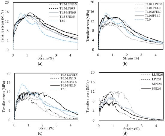 Tensile stress versus strain curves of (a) T0.5-PE1.5; (b) T1.0-PE1.0; (c) T1.5-PE0.5; and (d) PE2.0 series of specimens.