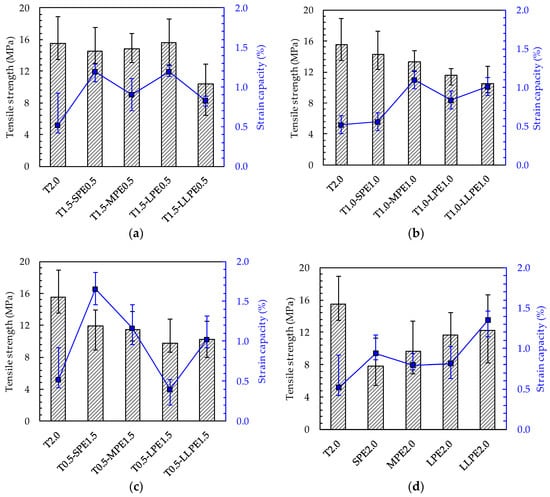 Tensile strength and strain capacity of (a) T0.5-PE1.5; (b) T1.0-PE1.0; (c) T1.5-PE0.5; and (d) PE2.0 series.