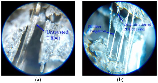 Microscopic images of UHPCC: (a) A untwisted T fiber and (b) elongation of LLPE fibers.