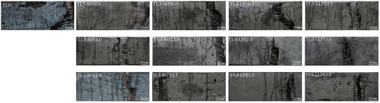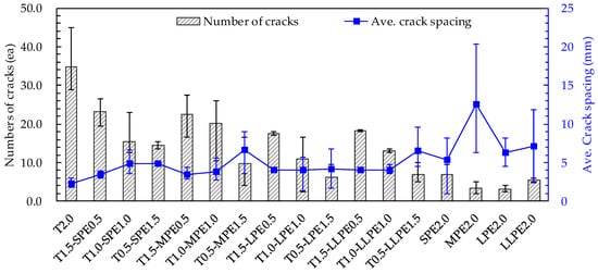 Typical crack patterns of the specimens are shown in Figure 7, while the average cracking behaviors in terms of the number of cracks and average crack spacing of all tested specimens are summarized in Figure 8. The most microcracks were formed in the T2.0 specimens (as many as 35 cracks per sample). The number of cracks decreased as the T fibers were replaced with PE fibers, and this became more significant when the aspect ratio of the PE fibers increased. By replacing 0.5% T fibers with SPE, MPE, LPE, or LLPE fibers, the measured number of cracks was reduced to 23, 23, 18, and 18 per sample, respectively (Figure 7). Subsequently, the number of cracks was further reduced to 16, 20, 11, and 13 per sample by adding 1 vol % PE fibers and 15, 10, 6, and 7 per sample by adding 1.5 vol % PE fibers, respectively. Finally, 7, 4, 3, and 6 cracks per sample were observed with only 2 vol % SPE, MPE, LPE, and LLPE fibers, respectively.