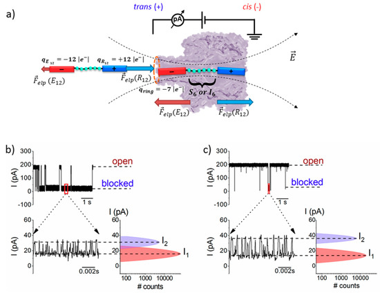 Schematic representation of the model resembling peptide interaction with the α-HL nanopore. (a) The R12 (bare charge ~ +12|e−|) and E12 (bare charge ~ −12|e−|) tails on the peptides, flanking a middle section containing either S6 or I6 amino acids are shown distinctly. As the peptide approaches the nanopore from the bulk, it experiences a stronger electric field () near the nanopore’s opening [41], which results in uneven electrophoretic forces ( elp) acting at the peptide’s oppositely charged extremities (at the shown +ΔV, the force acting on the R12 tail, elp(R12), is larger than the force acting on the E12 tail, elp(E12), thus driving peptide association to the nanopore). Once the peptide gets captured inside the nanopore, it assumes a meta-stable state, characterized to a first approximation (e.g., constant electric field across the nanopore from the applied ΔV) and at quasi-equilibrium conditions, by elp(R12) ≈ elp(E12). At neutral pH, the α-HL’s β-barrel entry is negatively charged (qring ~ −7|e−|). The selected original ionic current recordings illustrate the reversible blockades induced by the interactions of 20 µM trans-added S6-(Pe6) (b) and I6-containing peptide (Pe4) (c) with the α-HL, at ΔV = +100 mV. The representative zoomed-in segments below (b,c) show the ionic current fluctuations through the α-HL during a metastable capture of the corresponding peptides, and the corresponding ionic current amplitude histograms (see text).