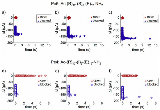 Opposite to the association process, we noted a slightly faster dissociation step from the nanopore of the more hydrophobic, isoleucine-containing Pe4 peptide (Figure 4d) as compared to the serine-containing one (Pe6) (Figure 4b). In accordance with the results from our group [45] and others [30,46,47], this finding fits in the scenario according to which non-specific electrostatic- and/or hydrogen bond-mediated interactions between the more polar peptide (Pe6), as compared to the more hydrophobic one (Pe4), and the nanopore’s inner wall, are major determinants of the overall friction experienced by moving peptide inside the nanopore, and contribute to a slowdown in the drift velocity of the Pe6 through the nanopore, relative to Pe4. Our findings complement others, emphasizing the requirement of hydrophobic binding sites to critically reduce the free energy barrier for translocating hydrophobic fragments of various polypeptides [48,49]. With possible benefits for the long term, these results reinforce the potential of the presented system for pinpointing the crucial contributions that govern biopolymers translocation through β-barrel proteins as a common scaffold used by protein-conducting channels, which is both ubiquitous and fundamental in many biological processes [50,51].