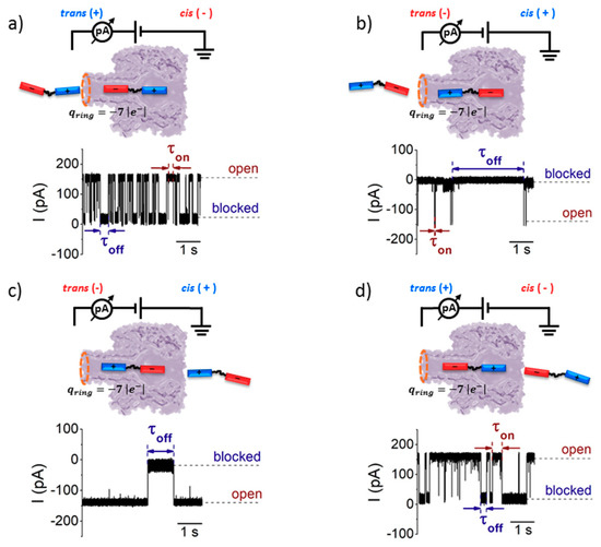 Figure 5. Sketch of the protocol aimed at studying the sidedness dependence of the S6-containing peptides-α-HL interactions. The peptide was added to the trans side of the membrane, and positive (a) or negative ΔVs (b) were employed to drive the peptide vectorially, with either the R12 or E12 moiety toward the nanopore’s β-barrel. The selected recordings below illustrate the details of current fluctuation through an α-HL inserted into a planar lipid bilayer, induced by the reversible peptide binding. The times between two consecutive peptide binding events (τon) and of the peptide transient residence inside the nanopore (τoff) are also shown. (c,d) Precise similar chains of events are represented, except that the peptide was present on the cis side of the membrane. Note that, in this case, to drive the peptide inside the nanopore’s vestibule with the same orientation as above (i.e., R12 or E12 moiety head on), opposite polarities of the applied ΔVs, as compared to those used in (a,b), are needed. - The electroosmotic flow (elo) favors peptide capture at negative potentials present on the peptide addition side. In such cases and judged from the peptide addition side perspective, the elo flow through the slightly anionic selective α-HL is directed toward the nanopore entry [33,43,52]. This implies that, for the trans-added peptides, electroosmosis favors the capture at negative ΔVs (i.e., the elo flow drives the peptide towards the nanopore) as compared to positive ΔVs (the elo flow drives the peptide away from the nanopore β-barrel and into the trans solution). Note however that, in the former situation (e.g., negative ΔVs), the electrophoretic force acting on the E12-containing moiety from peptides facilitate peptide migration toward the nanopore’s negatively charge β-barrel with the E12 tail head on, and this presents implications for the lumped force that determines peptides association to the nanopore (vide infra). The opposite occurs for cis added peptides, namely at negative ΔVs on the trans side, the elo flow drives the peptide away from the nanopore’s vestibule entry, while the elo flow elicited at positive ΔVs augment peptide association to the vestibule. As a side note, the elo flow is expected to be larger at the narrower, β-barrel section of the nanopore on the trans side (the mass flow rate in stationary state is constant, so that the smaller the cross-sectional area traversed by fluid, the higher the flow velocity).