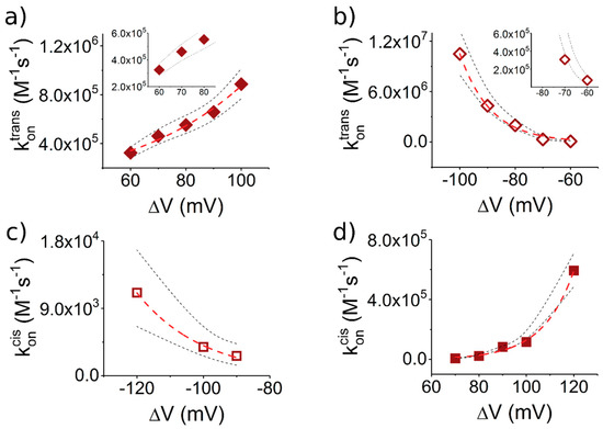 S6-containing peptides associate distinctly with the α-HL, depending of the polarity of the applied ΔV and the side on which they are added (cis or trans). All graphs display the voltage-dependent association rate constants (kon) of the Pe6 peptide (30 μM) with the α-HL. As in Figure 5: (a,b) the peptides were added to the trans side; and (c,d) the peptides were added on the cis side. The red dashed lines represent the best fit of the experimental data (open and filled rectangles) with the equation (see text). The dotted lines represent the upper and lower limits of the 95% confidence intervals for the estimated average values [40].