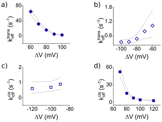 Dissociation rates of S6-containing peptides from the α-HL depend on the polarity of the applied ΔV and the side on which they are added (cis or trans). All the graphs display the voltage-dependent dissociation rate constants (koff) of the Pe6 peptide [30 μM] from the α-HL. As in Figure 5: (a,b) the peptides were added to the trans side; and (c,d) the peptides were added on the cis side. The dotted lines represent the upper and lower limits of the 95% confidence intervals for the estimated average values [40].