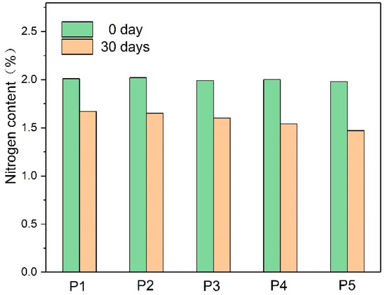 The sealed samples were placed in a 130 °C aging chamber for accelerated thermal aging. Parameters such as nitrogen content, degree of polymerization (DP) of cellulose, acid value, and dielectric loss of oil were measured, and the sampling time was 30 days. For convenience, the insulating papers modified with S0, S1, S2, S3, S4, and S5 were recorded as P0, P1, P2, P3, P4, and P5, and the insulating oils corresponding to the insulating paper were recorded as O0, O1, O2, O3, O4, and O5, respectively. Because of the low solubility of additives in oil and the low exchange speed between oil and paper, the initial values of oil tend to be similar. Hence, only 30-day samples of oil were sampled for analysis.