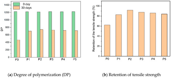 Figure 3 shows that the initial DP of the six paper groups was around 1220 and there were fewer differences before aging. After the 30-day aging process, the DP of the modified insulating papers (P1–P5) were higher than the DP of P0. Moreover, the DPs of P1 and P5 were lower than those of the other modified insulating papers, indicating that DICY and melamine should be added together. In addition, P2 had the highest DP, reaching 751—much higher than the DP of P0, which reached 450. The retention of tensile strength is another way to evaluate the aging level of insulting paper, and the 50% tensile strength had been considered to be the end of useful life. The overall retention results agreed with the DP results, whereas P2 had a higher retention of tensile strength than other modified papers.