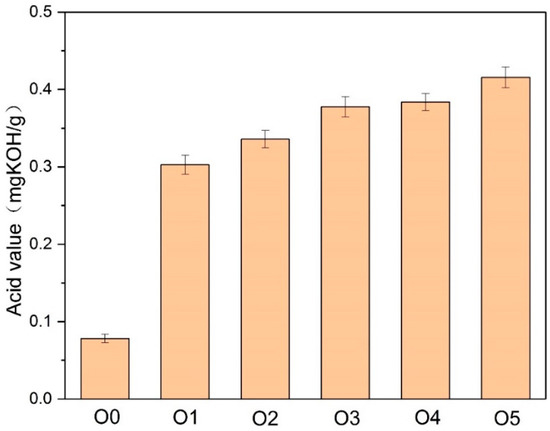 After the 30-day thermal aging, the acid value of the insulating oil with amine compounds was several times higher than that of O0. The amine compounds tended to enhance the acidity of the insulating oil during the thermal aging. In addition, the acid value of O1 was lower than that of O2–O5. Because of the absence of DICY in P1, the acid value was more likely to increase.