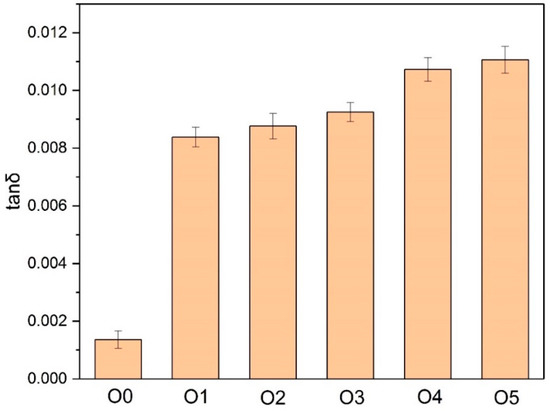 As shown in Figure 5, after the 30-day thermal aging, the dielectric loss factors of O1–O5 were higher than that of O1, indicating that under the same aging time, the aging products of O0 were smaller than in the corresponding insulating oils from S1–S5 with the added amine compounds. Among them, O5 got the largest tanδ, indicating that the most polarizing substances were produced in the aging process of O5, whereas the dielectric losses of O1 and O2 were relatively low, only higher than O0.
