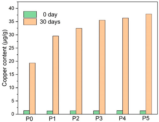 As shown in Figure 6, there were fewer copper compounds in the paper at the start of the thermal aging. The paper adsorbed part of the copper compounds during the aging process, whereas P0 got the minimum copper content among the six groups. In comparison, the paper modified with amine stabilizers obtained a higher copper content, and the paper with more DICY absorbed much more copper compounds after the 30-day thermal aging.