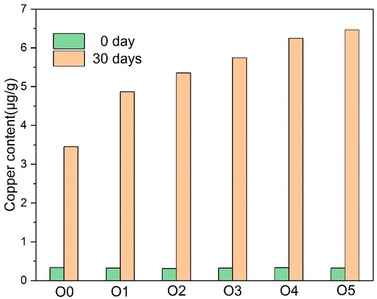 In Figure 7, the copper content in the insulating oil was consistent with the copper content in the insulating paper. The copper compound in the oil was at a very low level at the beginning of the thermal aging. The copper content of the oil increased significantly after the 30-day thermal aging, and the copper contents of the oils with the amine compounds (O1–O5) were higher than the oil with plain paper (O0). O1 without melamine had fewer copper compounds compared to other oils with modified paper.