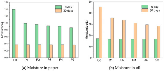 Figure 8 shows the moisture in both paper and oil. The amine compounds depleted the moisture in the paper, which led to the decrease of moisture in the oil, because of the diffusion and high moisture in the paper produced by the cellulose degradation. Compared with melamine, DICY reacted much more easily with water, and the oil in the groups with DICY (O2–O5) had lower moisture, whether in the paper or in the oil.