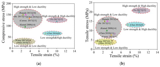 A summary of ECC strength and ductility in existing literature: (a) Compressive stress-tensile strain; (b) Tensile stress-tensile strain.