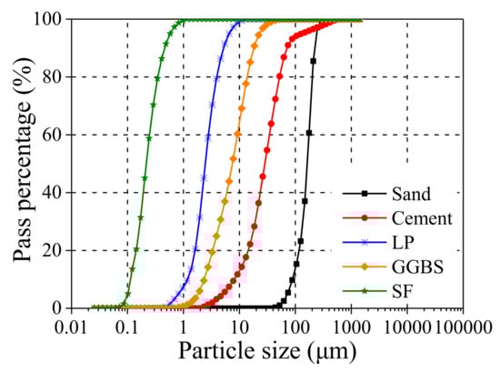 Gradation curves of cementitious materials and silica sand were determined from particle size analysis.