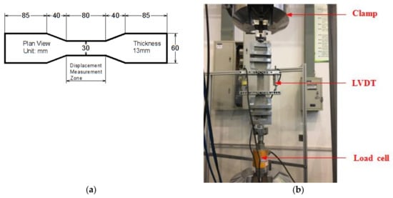 Set-up of tensile test: (a) dimension of dog bone specimen; and (b) setup.