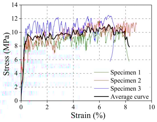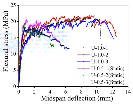 The flexural strength fu and the average flexural strength fa were calculated from the ultimate load Pu of the specimen under static loading. The flexural strength fu is the peak flexural stress of flexural stress-midspan deflection curve shown in Figure 7. As previously noted, the stress level S is defined as the ratio of the maximum fatigue stress σmax to the average flexural strength. The minimum fatigue stress was set to be 20% of the maximum fatigue stress herein. A total of four levels of stress were set, namely, 0.5, 0.65, 0.8, and 0.9, which cover fatigue characteristics from the high-cycle fatigue zone to the low-cycle fatigue zone. It is generally believed that concrete structures will not fail under the condition of fatigue loading if they can undergo up to 2 million cycles of fatigue loading without damage [18]. Therefore, the test was stopped when the specimen failed or the number of loading cycles reached 2 million.