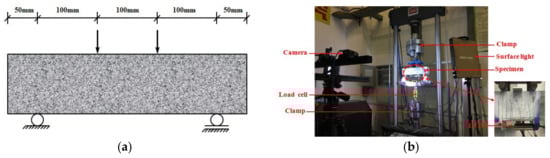 Set-up of the four-point bending test: (a) dimension of beam specimens; and (b) the VIC-3D set-up.