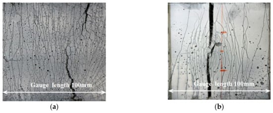 Figure 7 shows the flexural stress-midspan deflection curves of the four-point bending beams under statically loading. After 2 million fatigue loading cycles at a stress level of 0.5 without failure, the UHP-ECC specimens were statically reloaded to failure; then, their flexural behavior was compared to that of the UHP-ECC specimen, which was directly statically loaded to failure. These two types of specimens were respectively identified as U-0.5-n (static) and U-1.0-n, where n = 1, 2, 3. A suffix of “(static)” was appended to U-0.5-n to indicate the specimens were statically reloaded after fatigue loading. The results show that the average ultimate flexural stress of the specimens U-1.0-n approached 22 MPa, and the corresponding average mid-span deflection was greater than 10 mm. The average deflection-to-span ratio was greater than 1/30. Although the flexural strength after fatigue loading was reduced to 86% of that under direct static loading and the strain hardening part of the curve was shortened, the UHP-ECC specimens U-0.5-n (static) can still have a tensile strain capacity of more than 3%, indicating the UHP-ECC material had excellent ductility. The superior ductile properties of UHP-ECC were further manifested by its cracking characteristics, which agreed with the results in the flexural stress-mid-span deflection curve. Figure 8 shows the crack development at the bottom of the pure bending section of the UHP-ECC specimen. For specimens statically loaded to failure (U-1.0-n, where S = 1.0), the cracks spread throughout nearly the entire pure bending section with a small crack width and a large crack number; however, a large crack occurred when the specimen finally failed, as shown in Figure 8a. Meanwhile, the specimens that underwent a first fatigue loading and then static loading (U-0.5-n, where S = 0.5), for only fine cracks, which were distributed around the main cracks. The main crack widths were large, and the number was small, as shown in Figure 8b.