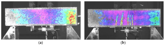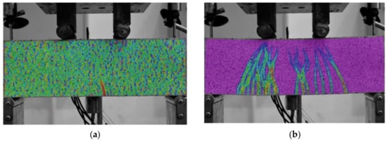 The crack development under fatigue cyclic loading where S = 0.8 was observed by the digital image technique DIC. The results are shown in Figure 14. No cracks (Figure 14a) occurred until the number of load cycles reached 30 (Figure 14b); then, the first batch of cracks appeared. When the number of load cycles reached 200 (Figure 14c), the number of cracks increased to 9, and the cracks no longer increased in size. After 200,000 load cycles, large cracks (shown in the red circle in Figure 14d) appeared locally, and the specimen was about to break. Similar to the cracks under static loading, as shown in Figure 9, the cracks occurred mainly in the pure bending section and its vicinity, but the number of cracks and the ductility were significantly reduced.