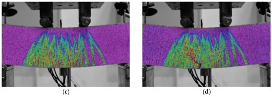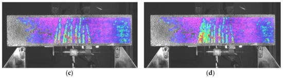 Crack patterns of flexural beam at S = 0.8 by DIC: (a) no crack (29 cycles); (b) fifth crack (30 cycles); (c) ninth crack (200 cycles); and (d) main crack (20,000 cycles).