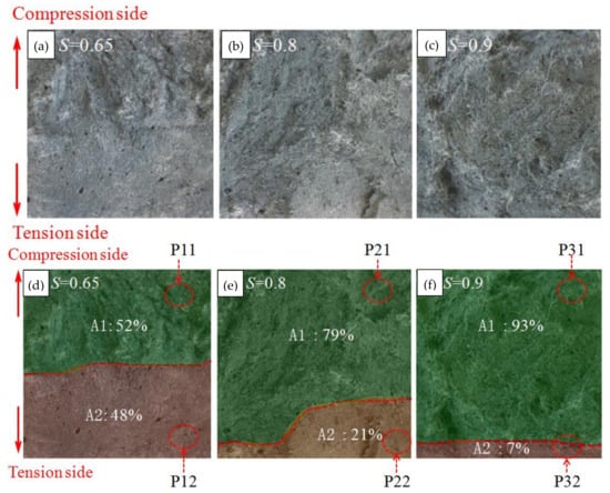 Failure sections of UHP-ECC at different stress levels: (a) S = 0.65; (b) S = 0.8; (c) S = 0.9 before image processing; and (d) S = 0.65; (e) S = 0.8; (f) S = 0.9 after image processing.