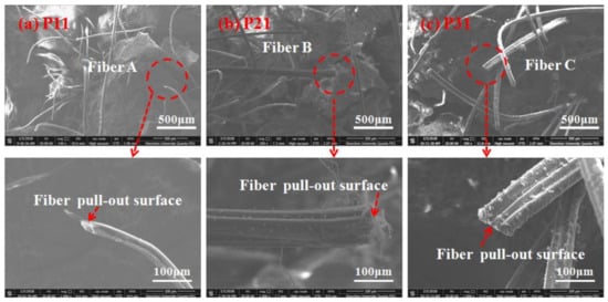 SEM images of the fiber pull-out surface: (a) P11; (b) P21; (c) P31 as marked in Figure 10d–f; respectively.